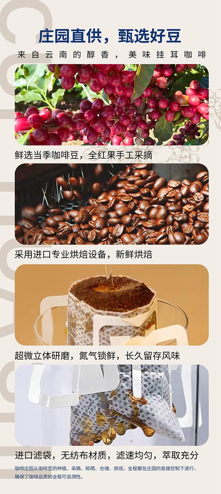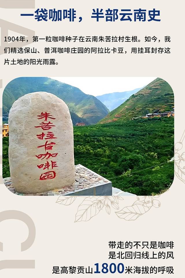 1892年,第一粒咖啡种子在云南朱苦拉村生根。如今,我们精选云南保山、普洱精品阿拉比卡豆,用挂耳封存这片土地的阳光雨露。