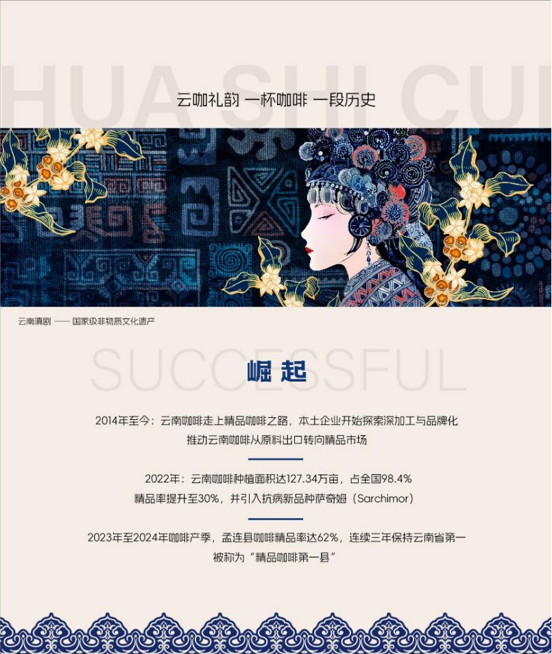 云咖礼韵 一杯咖啡 一种风情 一段历史 崛起 2014年至今:云南咖啡走上精品咖啡之路,本土企业开始探索深加工与品牌化,推动云南咖啡从原料出口转向精品市场。 2022年:云南咖啡种植面积达127.34万亩,占全国98.4%,精品率提升至30%,并引入抗病新品种萨奇姆(Sarchimor)。 2023年至2024年咖啡产季,孟连县咖啡精品率达62%,连续三年保持云南省第一。被称为“精品咖啡第一县”。 品种:萨奇姆 日晒 浅中烘焙 风味:苹果,坚果,酸质柔和
