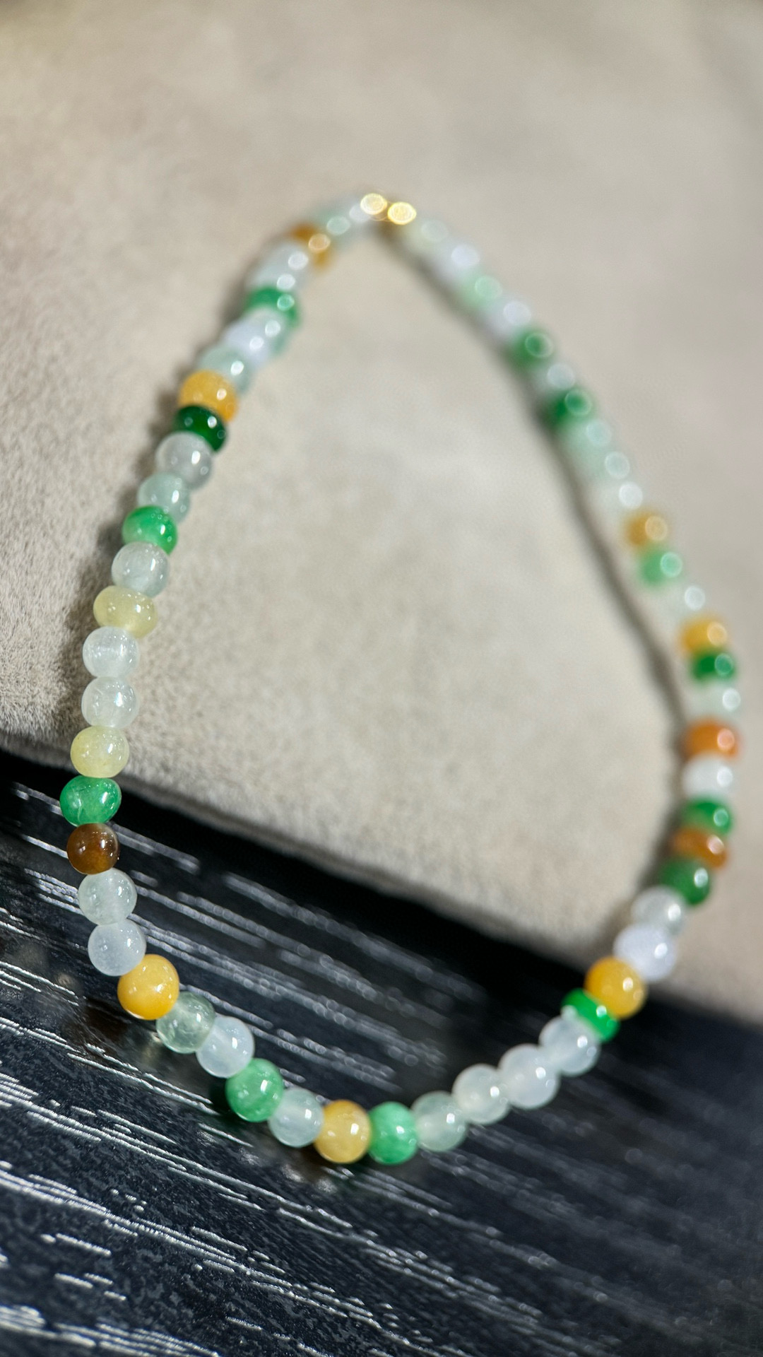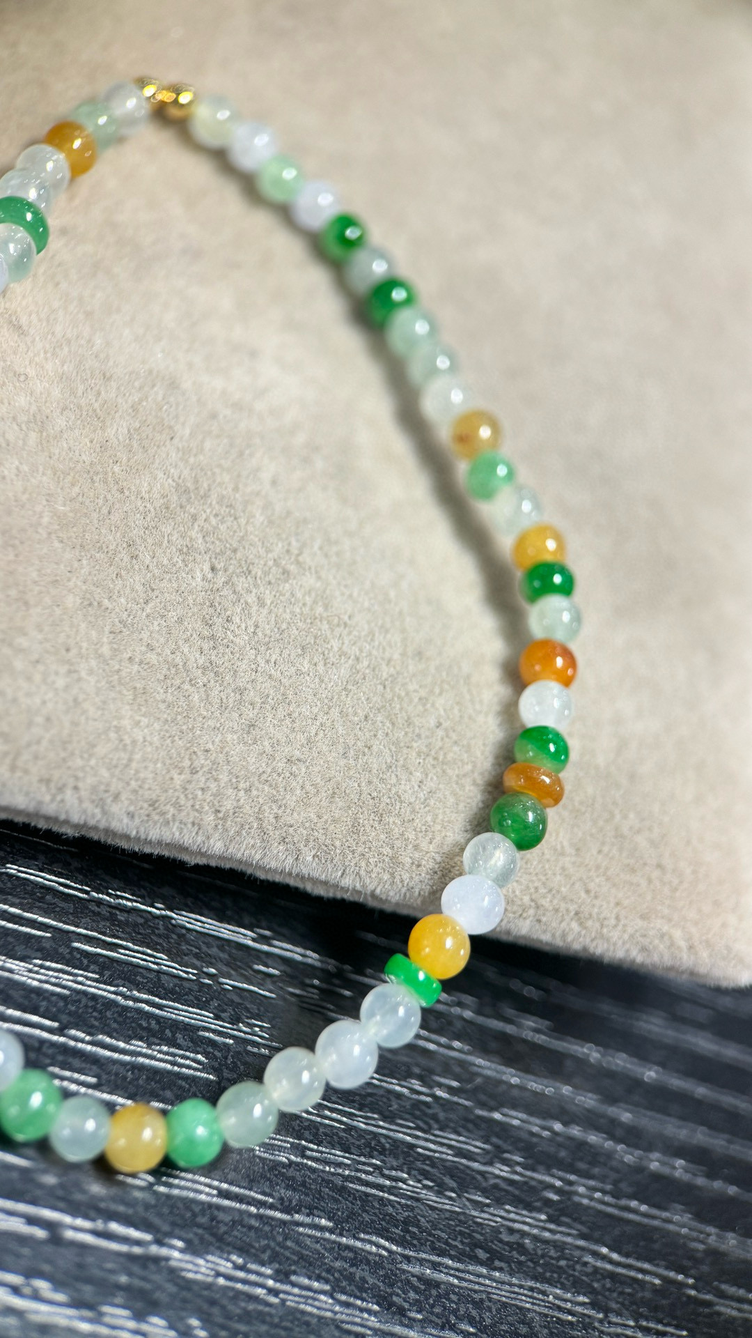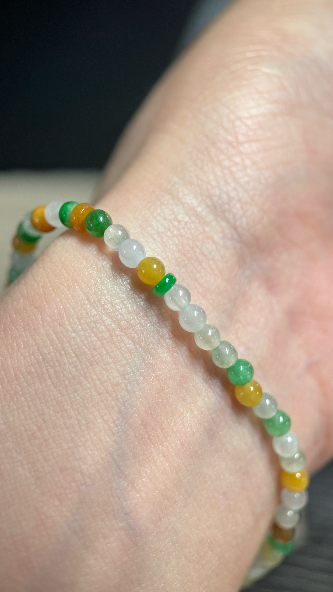 冰种三色翡翠珠串,尺寸2.8-3mm,白冰翡翠,天然黄翡,辣绿翡翠串在一起,非常漂亮有活力,秒杀价格299元