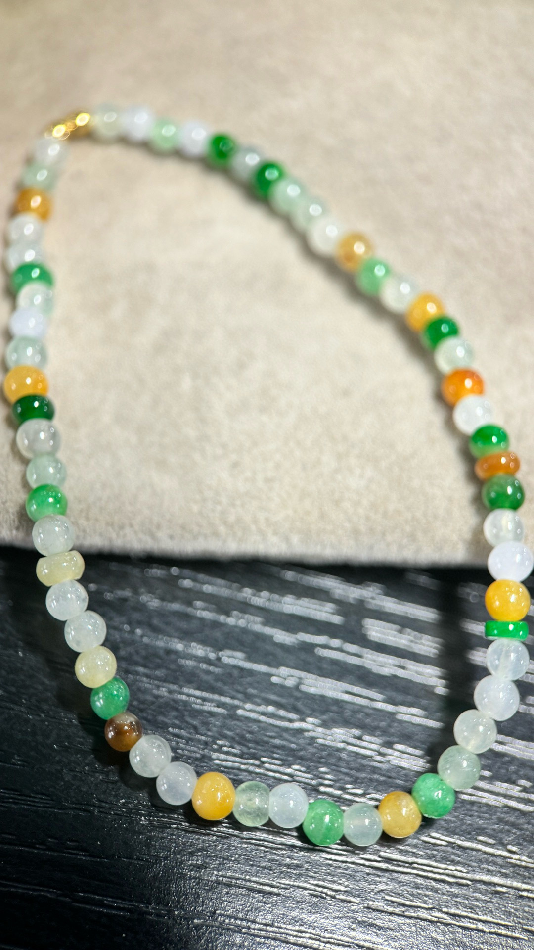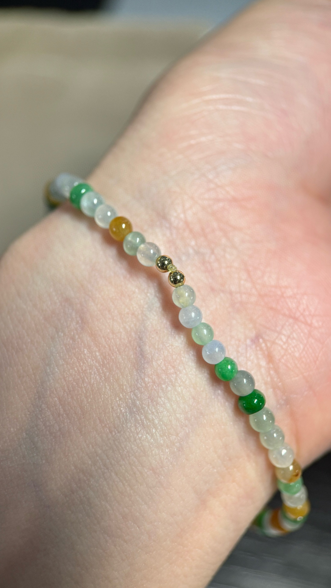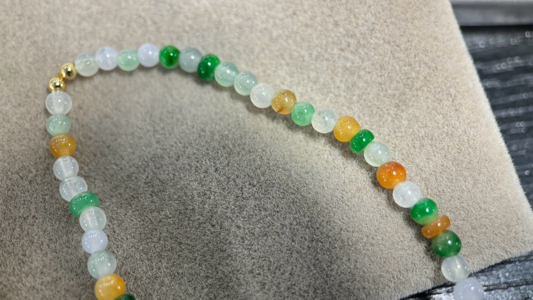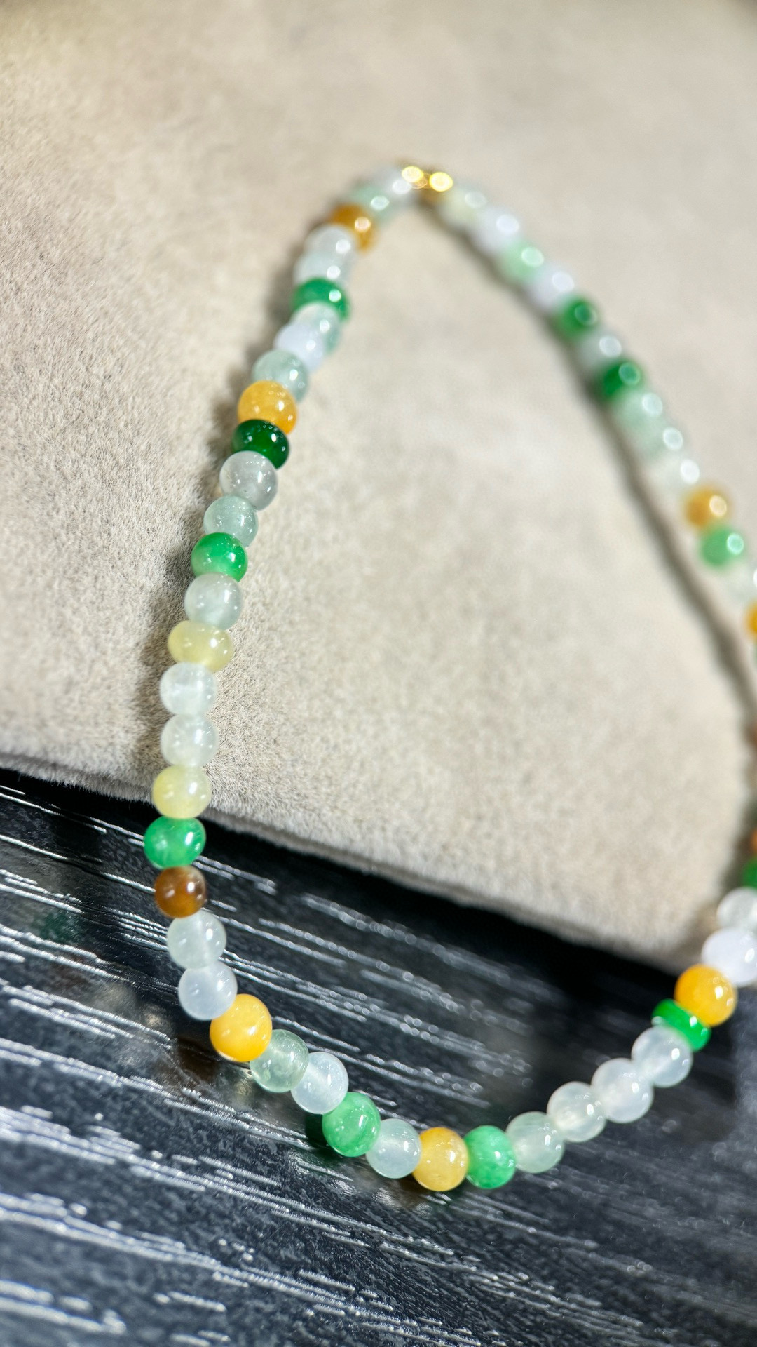 冰种三色翡翠珠串,尺寸2.8-3mm,白冰翡翠,天然黄翡,辣绿翡翠串在一起,非常漂亮有活力,秒杀价格299元