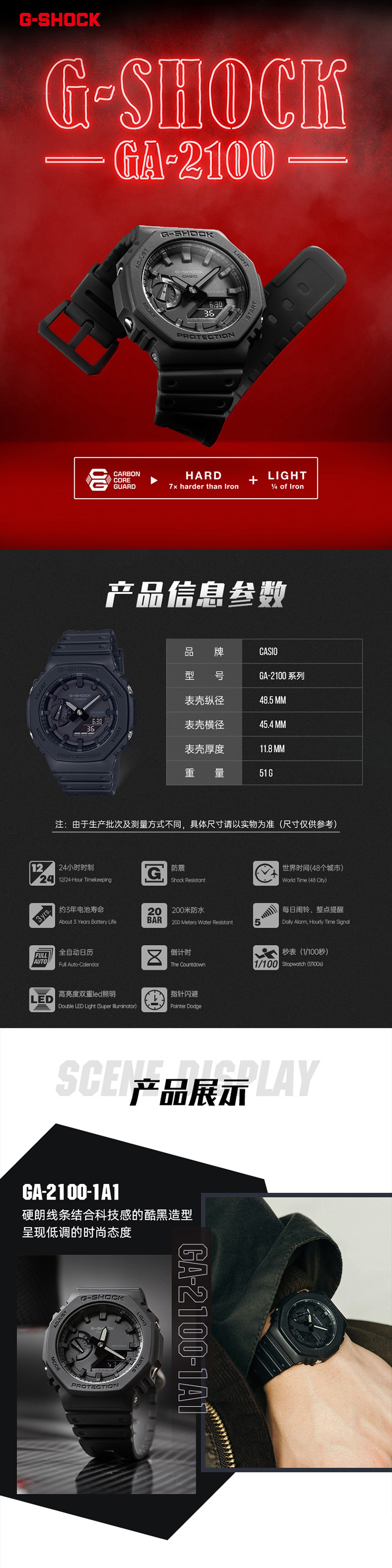 卡西欧(CASIO)G-SHOCK GA-2100运动八王子防水男表石英手表GA-2100-1A1PR 200米防水