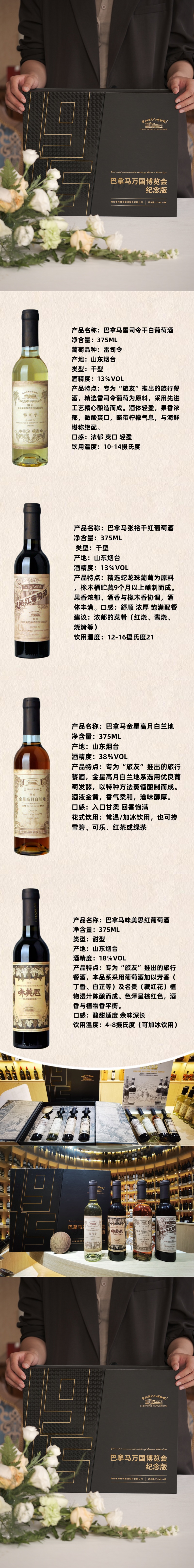 礼盒内容: 巴拿马雷司令干白葡萄酒纪念版 375ML*1 巴拿马张裕干红葡萄酒纪念版 375ML*1 巴拿马金星高月白兰地纪念版 375ML*1 巴拿马味美思红葡萄酒纪念版 375ML*1