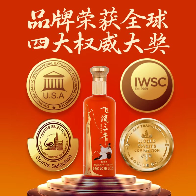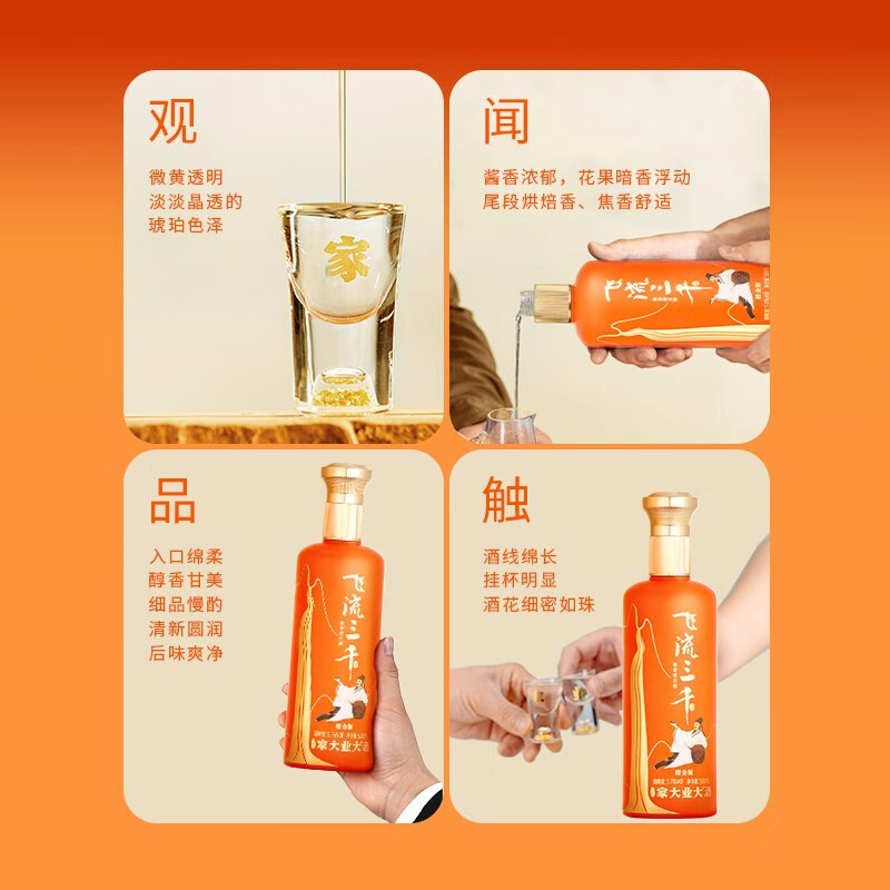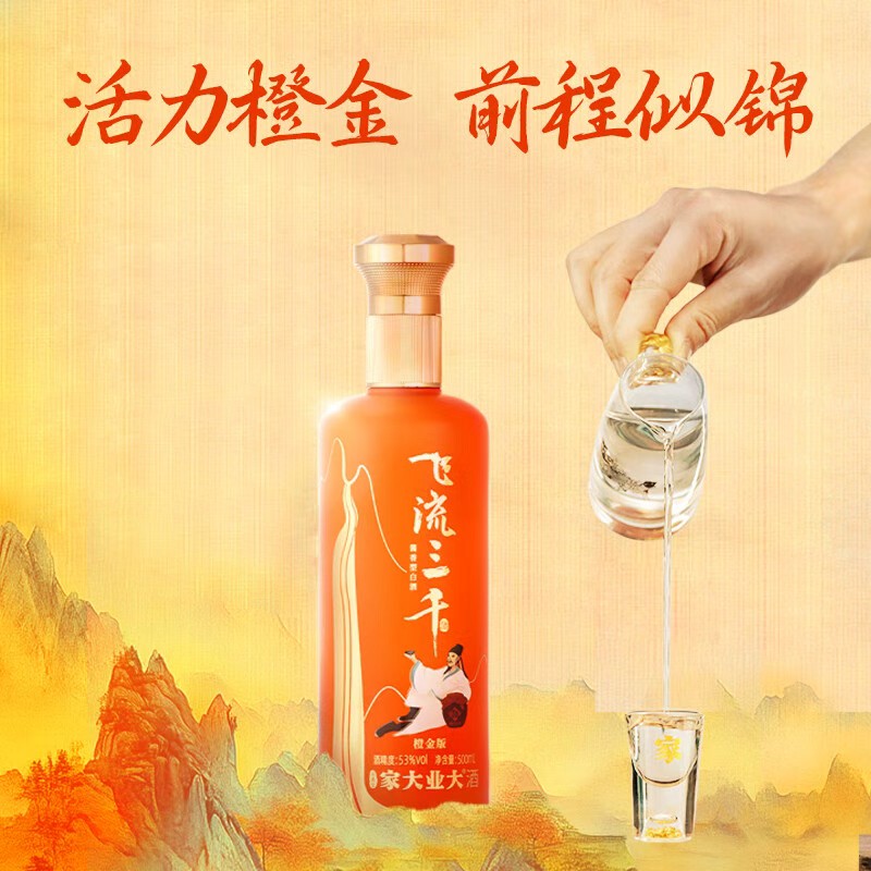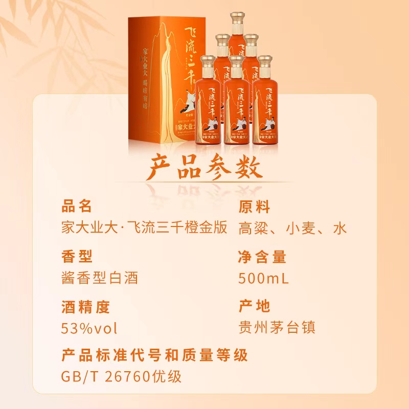 品名:家大业大·飞流三千橙金版 产地:贵州茅台镇 规格描述:飞流三千橙金版500ml*6瓶 包装方式:瓶装 原料成分:水 高粱 小麦 生产酿造工艺:固态发酵法 包装种类:礼盒装箱装 度数:53%Vol. 产品标准号:GB/T 26760 优级