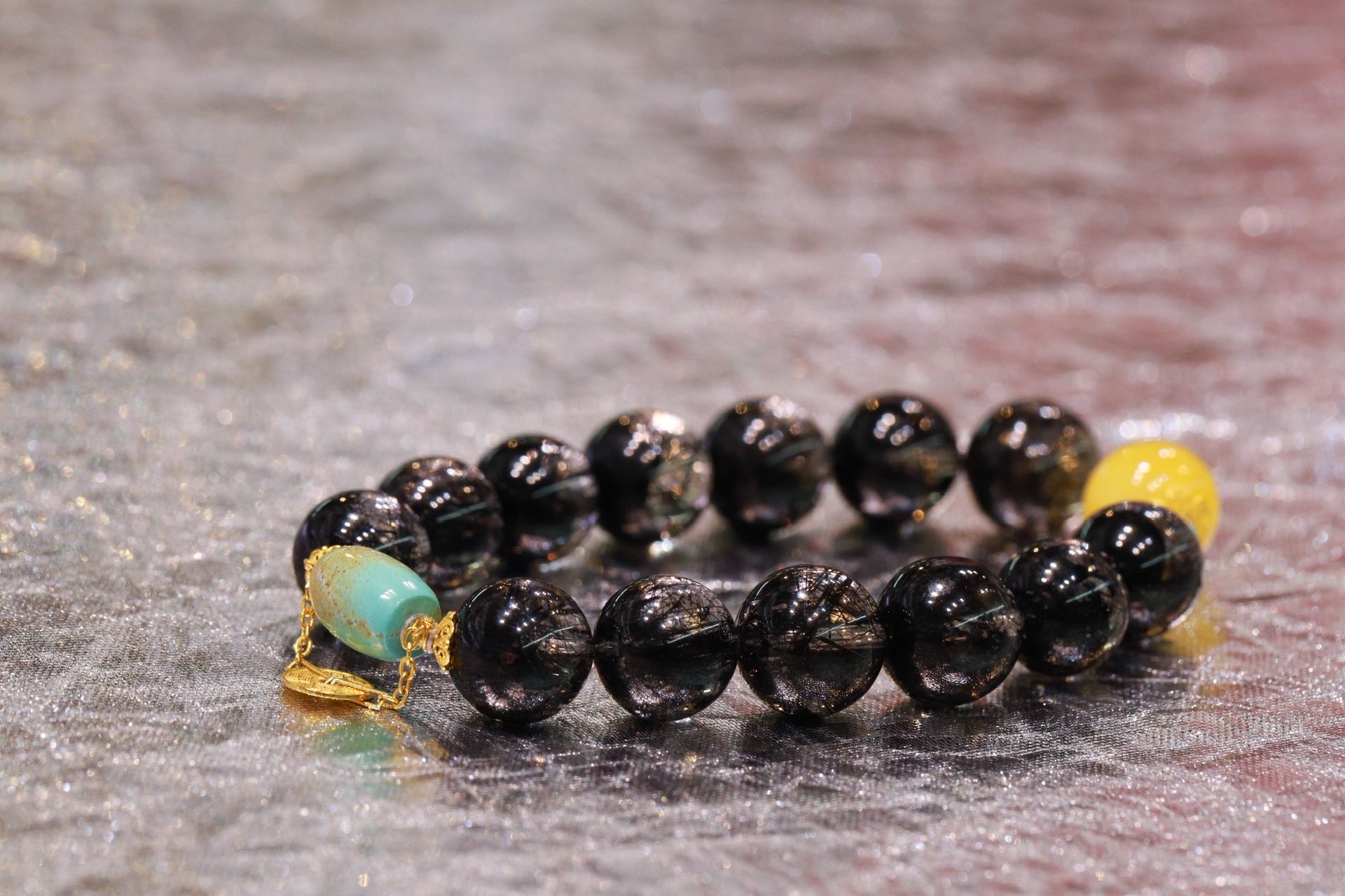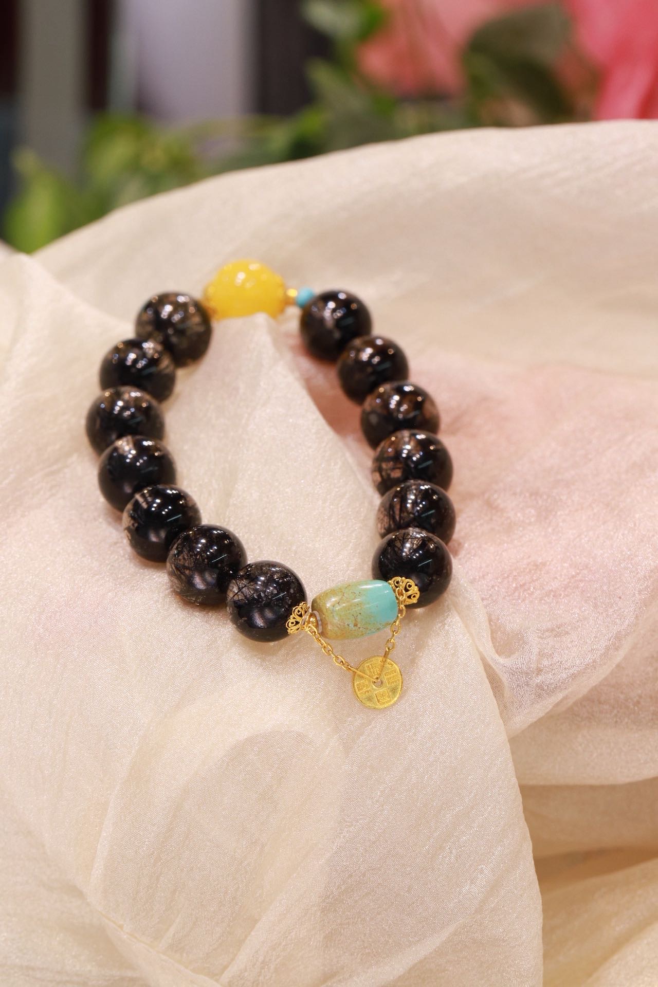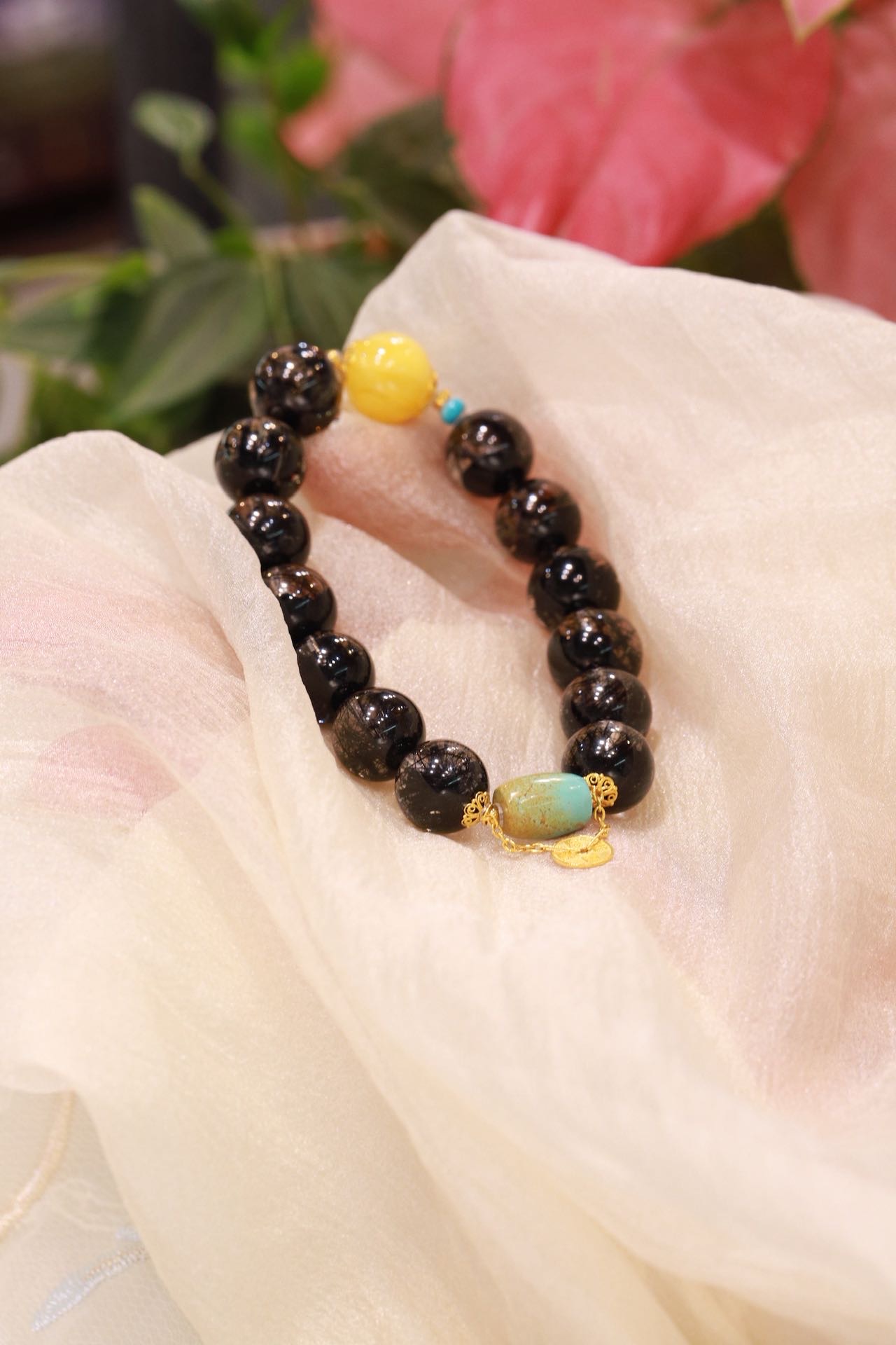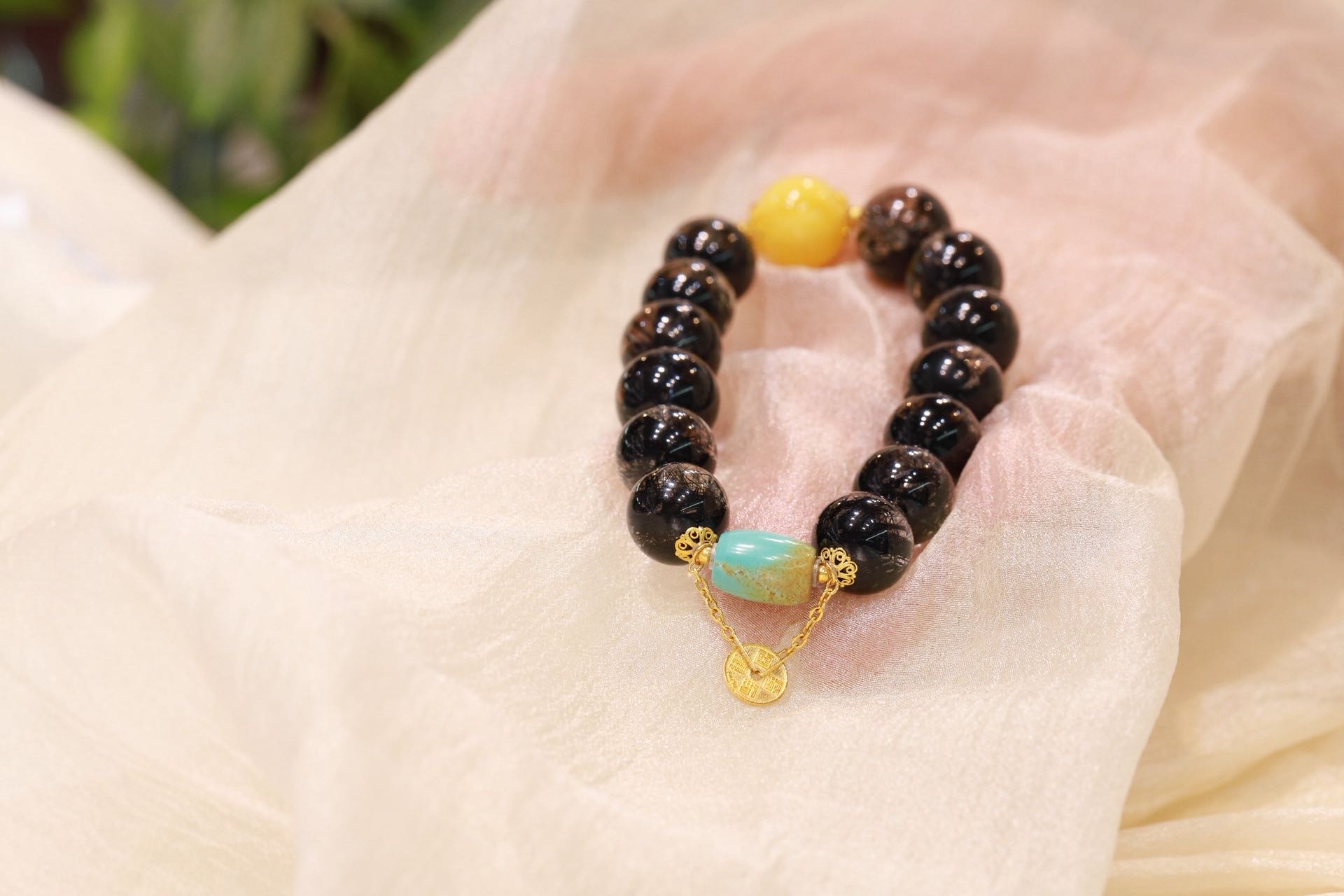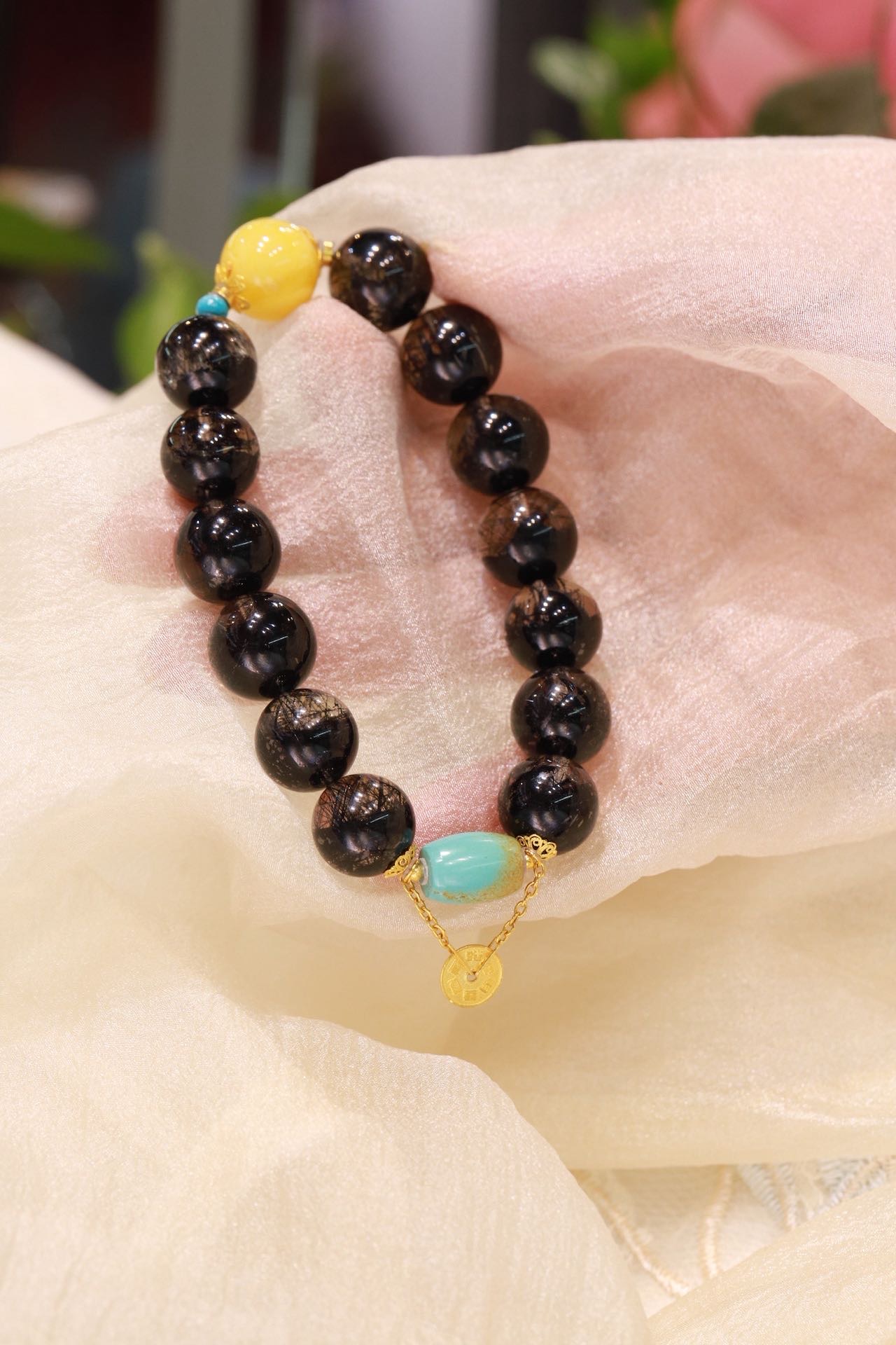 黑发晶圆珠手链 搭配18k金配件,蜜蜡、绿松石