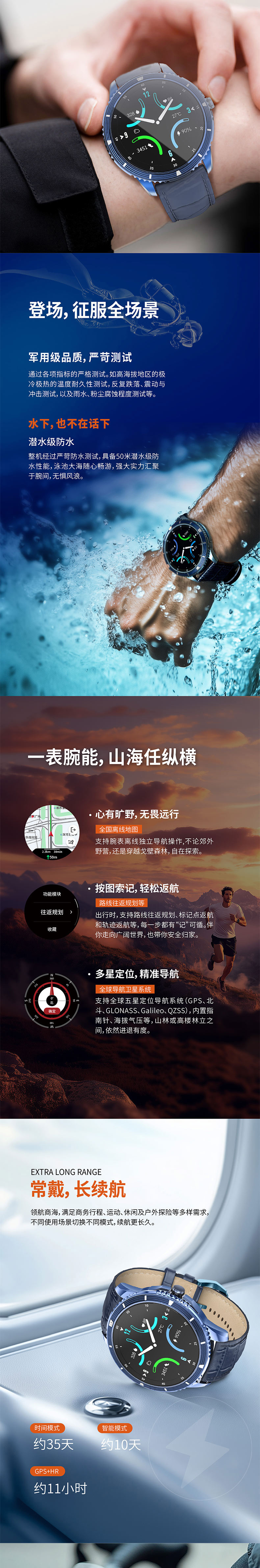 电池续航:智能模式:约10天、GPS+HR:约11小时、GPS+HR+音乐:约6小时、时间模式:约35天