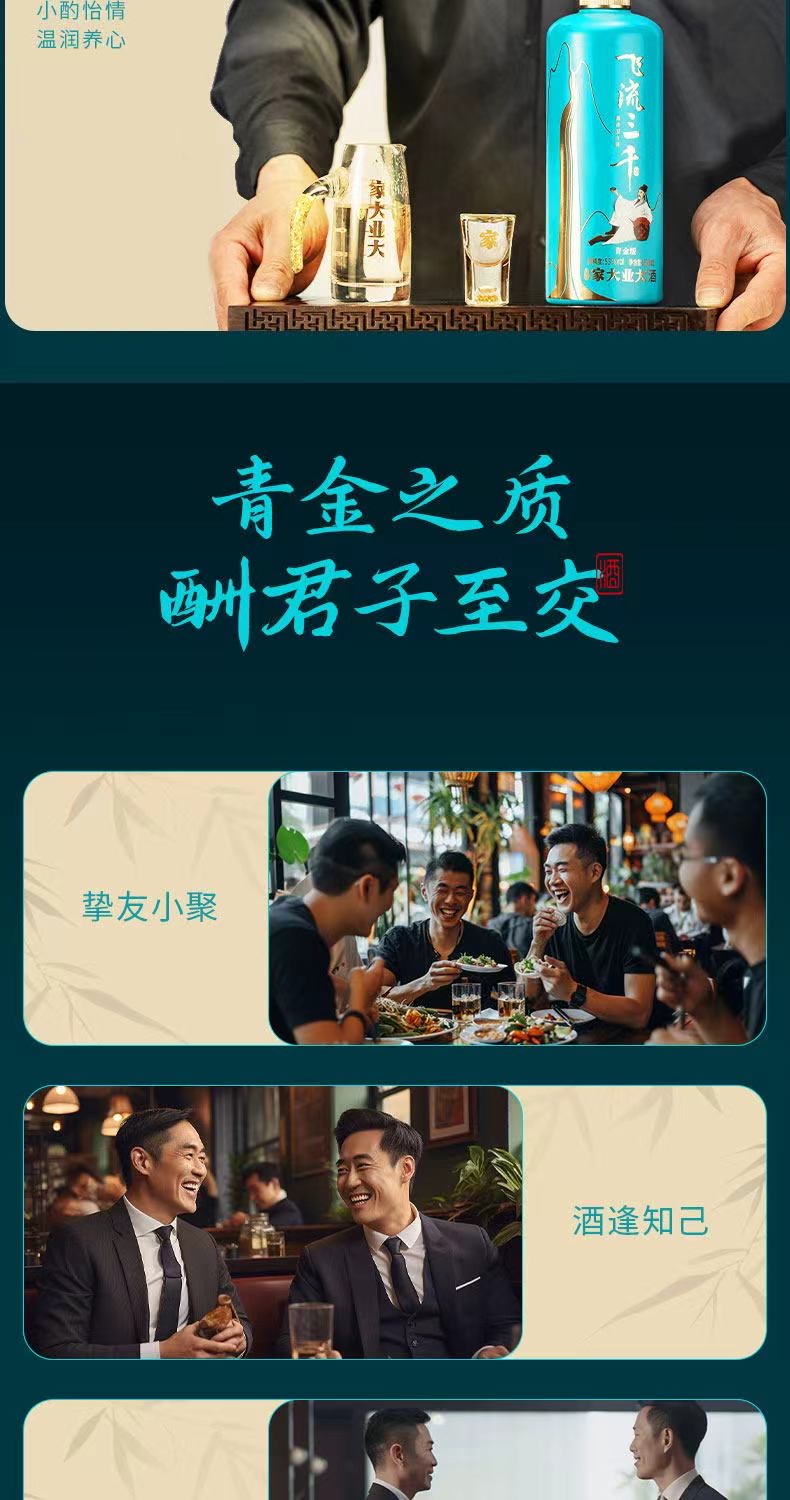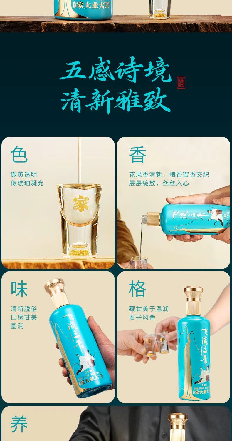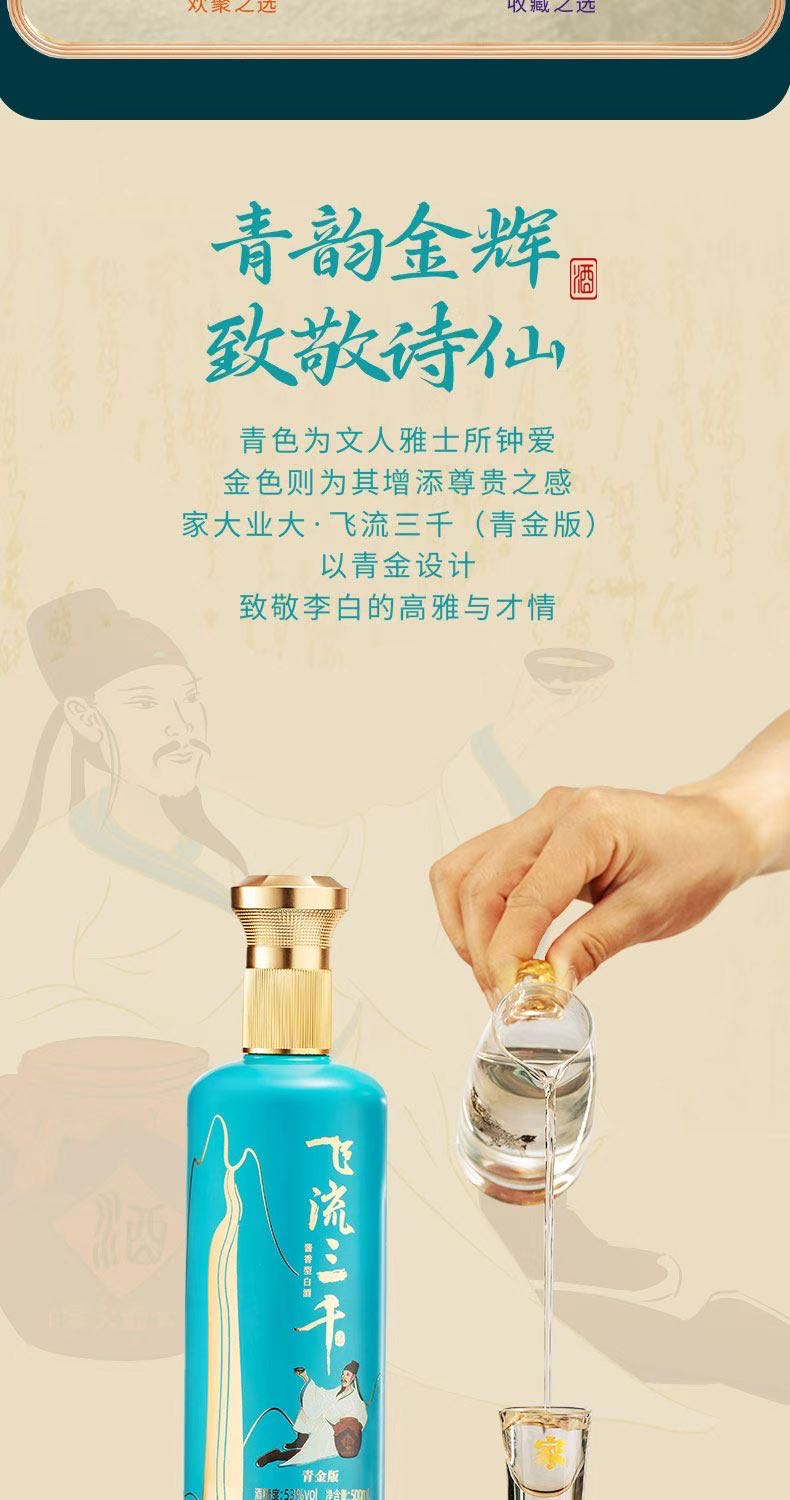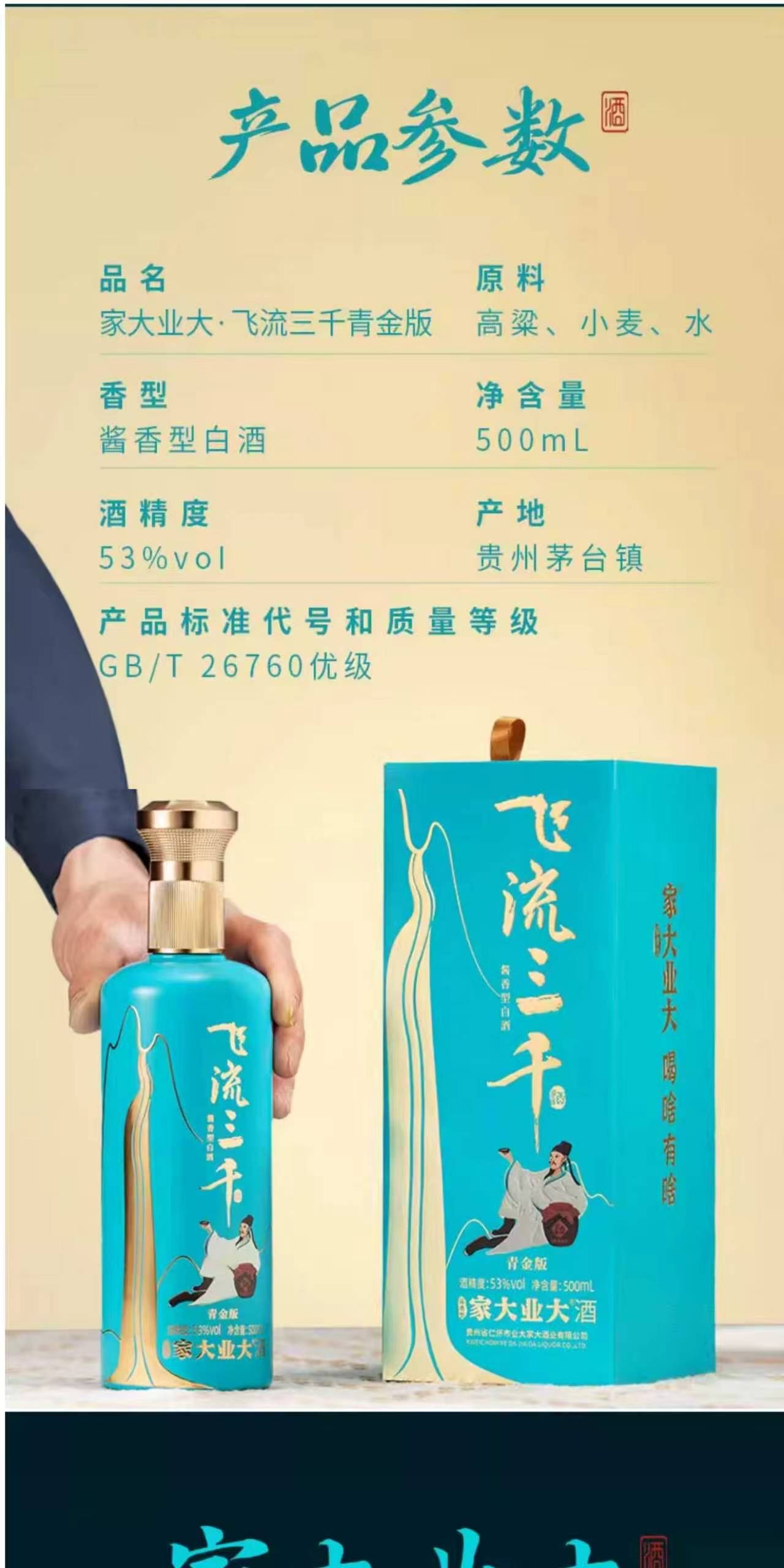 品名:家大业大飞流三千青金 净含量:500ml*2瓶 储存条件在阴凉、干燥、通风的条件下保存 酿造工艺:固态发酵法 配料表:水、高粱、小麦